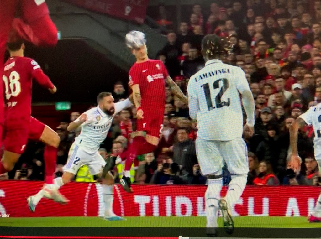 Sur une attaque de Liverpool, le défenseur madrilène Carvajal bouscule l’attaquant des Reds Darwin Nunez qui essaye de reprendre un ballon de la tête. L’arbitre ne siffle pas un pénalty pourtant évident.